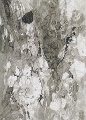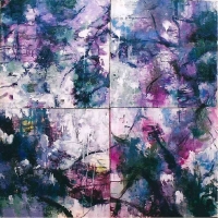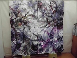 油彩による試作2 S25×4S25号を4枚組み立てるとS100と同サイズとなる。作者はS25一枚としての画面と同時にS100号のエスキーースとしての役割を与え、うすくといた絵の具を流す、たらす、滲ませるなどのオートマティックな扱いのもとに試作。そこに自由なドローイングが重ねられる。4枚の画面は様々な組み立てのバリエーションを持ち構成の思索に繋がって行く。