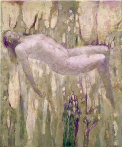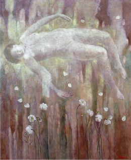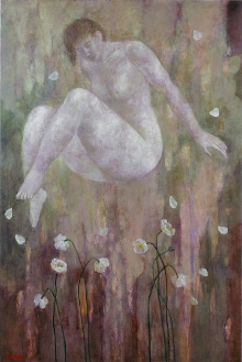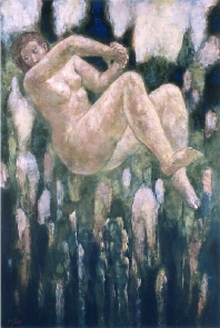 この先何処に行くのだろう。強い不安を抱えた今の時代の心境をこの作品に託した。ゆったりと浮いているとも落ちているとも取れる(ひと)の形を強調し描いた。下方から延びる植物の芽を新たな生の象徴として対比した。F120号とF130号の2点を競わせ描きその内一点を第81回春陽展に出品した。
