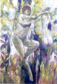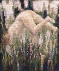 2006年第83回 春陽展「水の記憶」F120号「月光」「弦無」では豊かな死へのイメージを捉え「水の記憶」では羊水を漂う胎児への回帰をイメージし描いた。湿潤でねっとりとした形体の斑点が空間を埋め尽くし、落下しているともとれる人物を浮かび上がらせている。絵を描くことは生(エロス)と死(タナトス)の表裏一体の関係から逃れることは出来ない。すべての生には死の気配が漂う。季節の移ろいの中に繰り返されるその気配を嗅ぎ分けたい。