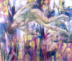 2007年 第84回 春陽展「宙」F130号第84回展は一人4mの壁面が与えられF130号2点を出品することが出来ました。2作目の「宙」は弥勒菩薩の半跏思惟の形を採っています。大きく足を拡げエロチックに感じるポーズですがヨガやバレーにも繋がる精神の安定した様子を示す形なのです。薄い布を肩から掛け、すーっと浮いています。激い動きの「春雷」に対し内面の情熱を示すものとして対比させました。