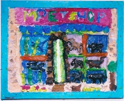 アクリル絵の具を使ってのびのびと絵をかきましょう。絵本制作を中心として絵画作品は全て画集として製本しお渡しします。展覧会を行わないかわりに本として製本し多くの方に見て頂くようアトリエの願いです。制作のための画材(画用紙・アクリル絵の具・ふで・絵の具溶き皿・水入れなど全て)をアトリエで準備しますから、手ぶらでどうぞ。皆さんは元気な描く気持ちできていただきます。