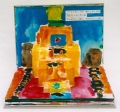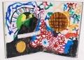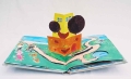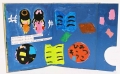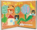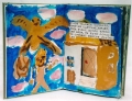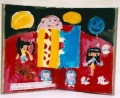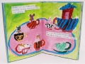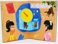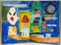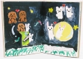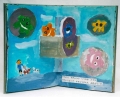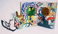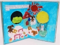 始めはお家のドアがひらく簡単なしかけから始まりページとページを通り抜け異なる世界に入り口を作りました。ページの中心線にシンメトリーになるように箱形を張り込み(左から2番目)それを繰り返すと左から3番目のような建物が出来上がります。右の立ち上がる形も基本はシンメトリーです。前に倒すようにのり代をとって張り込み本を開くと、ぐっと立ち上がります。複雑な立ち上がりも慣れると出来るようになります。